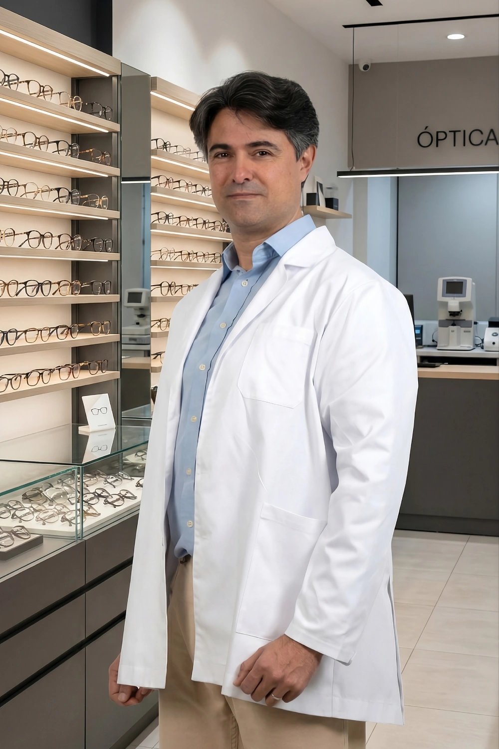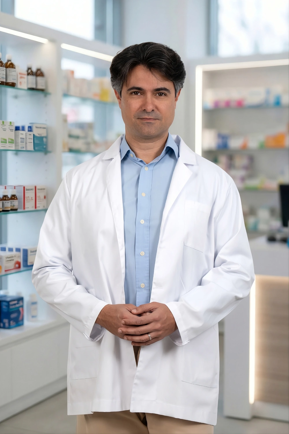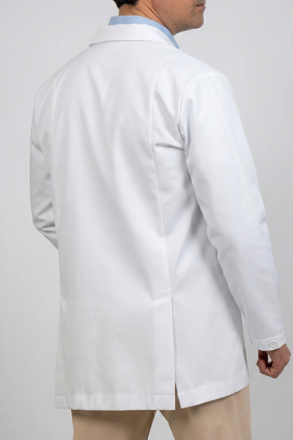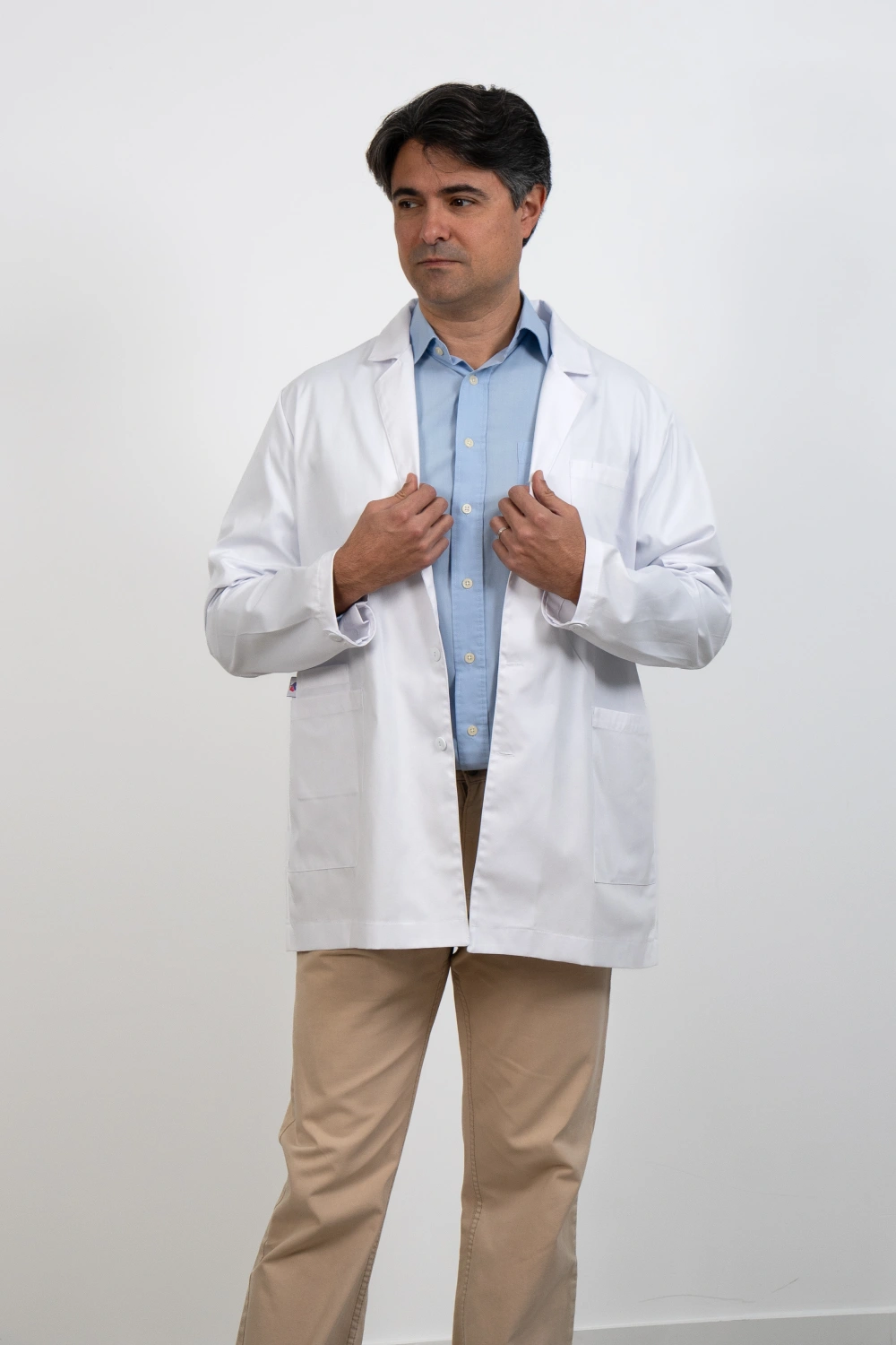 Bata Sanitaria corta hombre en sarga premium. Ideal para farmacia, óptica, herbolarios y clínicas. Personalizable con bordado de logo y nombre. ¡Calidad profesional!